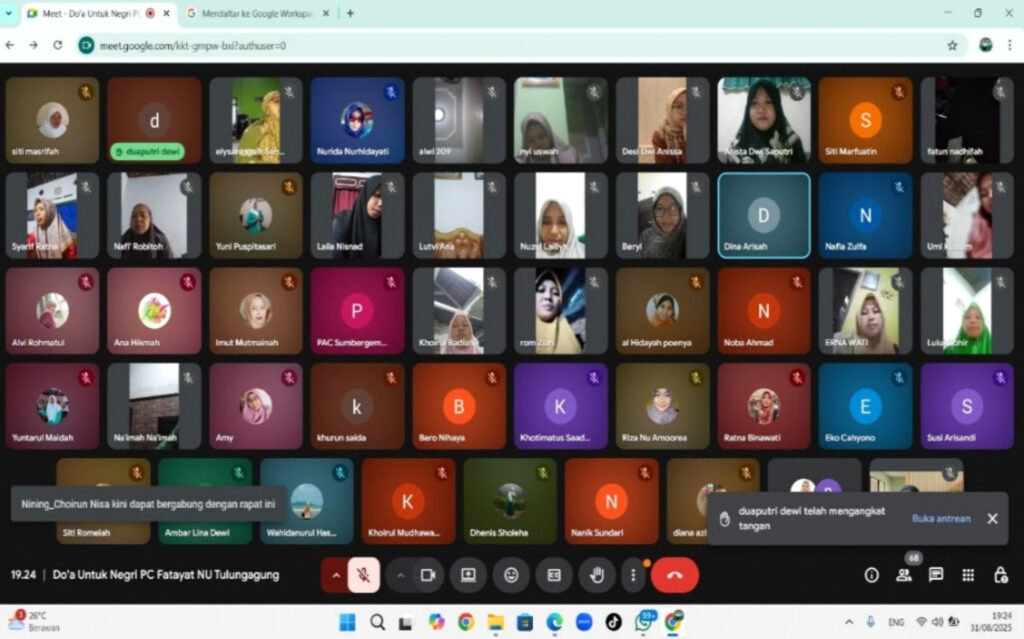Tulungagung—Menyikapi situasi nasional yang kian memanas akibat aksi demonstrasi yang menelan korban jiwa dan memicu kerusuhan di sejumlah daerah, Pimpinan Cabang (PC) Fatayat Nahdlatul Ulama (NU) Tulungagung menggelar kegiatan “Doa Bersama untuk Negeri” pada Minggu (31/8/2025). Acara ini dilaksanakan secara virtual melalui platform Google Meet dan diikuti oleh ratusan kader Fatayat NU dari berbagai kecamatan di Tulungagung.